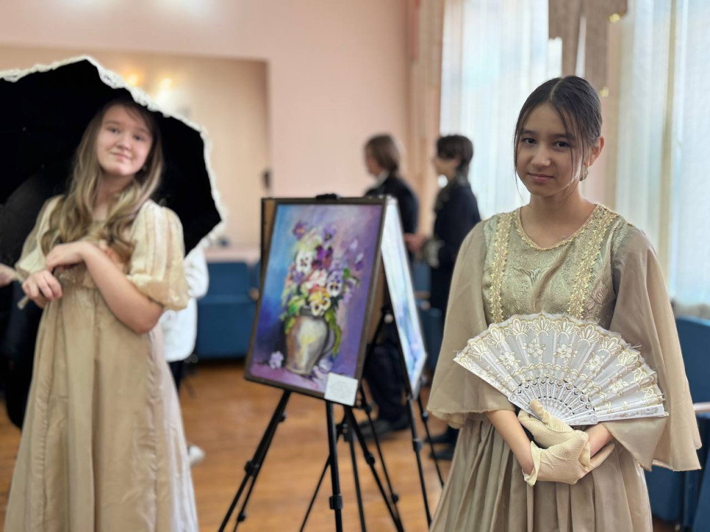 Следующей зоной стал бальный зал. Там проходила выставка «Симфония сиреневых грез». По залу неспешно прогуливались артисты в костюмах XIX века – их элегантные силуэты, изысканные манеры и утонченные жесты словно перенесли гостей в далекую эпоху балов и романтических встреч. Каждая деталь экспозиции дышала историей и красотой, заставляя замирать от восхищения.